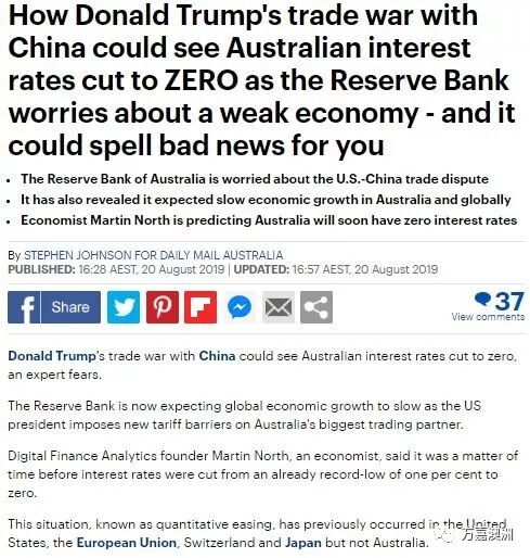 一位专家担心,Donald Trump与中国的贸易战可能导致澳大利亚的现金利率降至零。澳储行(Reserve Bank of Australia,RBA)目前预计,由于美国总统对澳大利亚最大贸易伙伴施加新的关税壁垒,全球经济增长将继续放缓。Digital Finance Analytics的Martin North表示,澳大利亚的现金利率从已经创纪录的1%降至零只是时间问题。以前美国、欧盟、瑞士和日本都发生过这种被人们称为“量化宽松(Quantitative Easing,简称QE)”的情况,但澳大利亚没有发生过这种情况。8月20日,马丁在一篇博客中写道:“目前可以确定的是,疲软的全球经济前景可能会使他们(澳储行)再次降息。量化宽松政策即将来临。”本月早些时候,澳储行行长Philip Lowe在国会听证会上承认,尽管零利率不太可能实现,但这却是一种可能的情况。如果实施了量化宽松政策,澳储行可能会通过购买国债等中长期债券,增加基础货币供给,向市场注入大量流动性资金,换句话说就是间接增印钞票。对于在澳大利亚申请贷款的人而言,这可能意味着标准的可变住房贷款利率仅为2%。目前大约3%的抵押贷款利率已经是上世纪50年代以来的最低水平了。虽然较低的利率对住房贷款人来说是个好消息,但对靠吃银行存款的利息生活的退休人员来说却是个坏消息。6月和7月的一系列降息举措尚未刺激到澳大利亚经济,更宽松的货币政策表明,澳储行还在担心失业率上升。澳储行在8月6日公布的8月份会议纪要显示,“鉴于美中贸易和技术争端升级”,他们现在对世界经济的乐观程度还不及5月份。