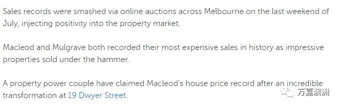 7月最后一个周末,墨尔本的在线拍卖打破了两个郊区的销售记录,为房地产市场带来了积极影响。