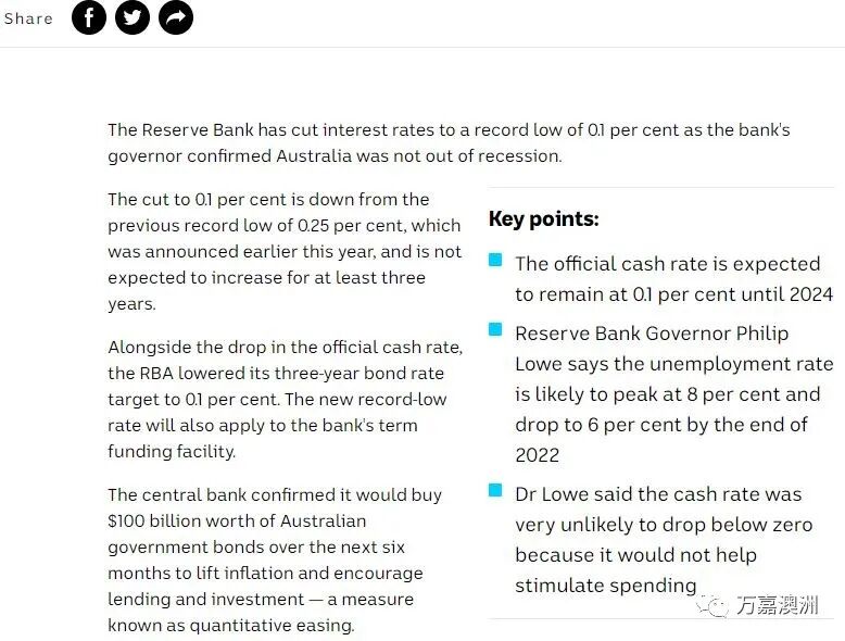 为了帮助澳洲从疫情导致的经济紧缩中复原,澳洲央行(RBA)3日宣布将官方现金利率下调至创历史新低的0.1%,并宣布了一系列其他措施。