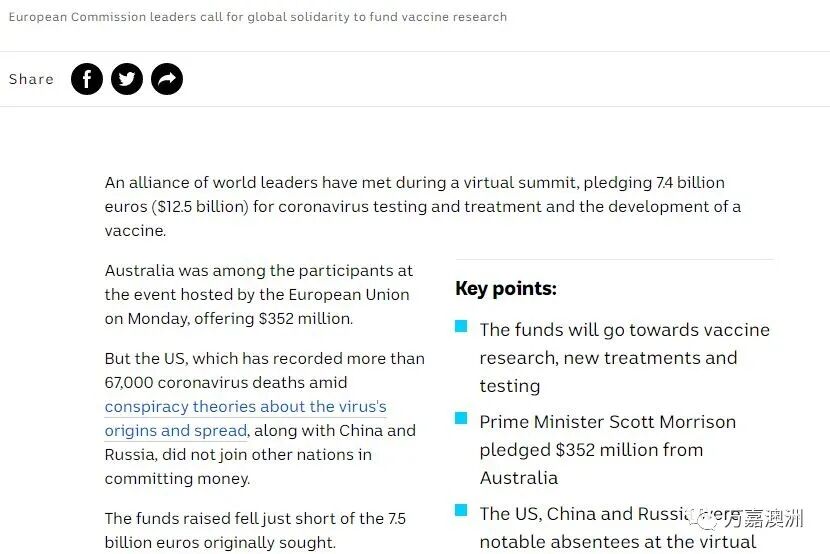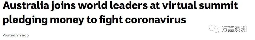一些世界领导人组成的联盟召开了一个虚拟峰会,誓言投资74亿欧元用于冠状病毒测试和治疗以及研发疫苗。澳洲也参加了欧盟于周一主持的这个会议,并表示会出资3.52亿澳元。