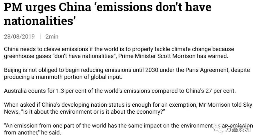 总理莫里森周三说,如果全球要妥善应对气候变化,那么中国需要解决碳排放问题。他说温室效应是没有国界的,全世界都会受到影响。根据各国签订的巴黎协定,北京没有义务在2030年之前开始减排。据统计到目前为止,澳洲的碳排放量占全球的1.3%,而中国为27%。当skynews节目主持人对总理莫里森说,中国是发展中国家,是有碳排放豁免权的。总理莫里森就回答说,豁免权是针对经济发展呢还是环境保护?他说,来自世界某一地区的排放对环境的影响,与另一部分地区的排放具有相同的影响。如果是关于减少炭排放,那么我们需要在全球范围内都要减少碳排放。总理周一晚上告诉天空新闻的记者,中国和其他发展中国家,需要做更多的工作来应对气候变化。