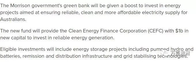 莫里森政府的绿色银行将获得拨款以投资于能源项目,这些项目旨在确保澳洲人获得可靠、清洁和负担得起的电力。清洁能源金融公司(CEFC)将获得10亿澳元新资金用于投资可靠的能源发电。符合条件的投资将包括储能项目,包括抽水蓄能和电池、减排和配电基础设施以及电网稳定技术。新投资还涵盖了5月大选之前宣布的政府的承包新一代投资(UNGI)计划。这包括抽水蓄能、电池和天然气等项目。UNGI的计划项目之一是Lake Macquarie燃烧电厂的升级,但是政府表示CEFC无法分配给煤炭项目,此类项目将没有资格获得新资金。新资金与去年底对绿色银行的投资授权相关,以专注于电网稳定技术。能源部长Angus Taylor表示,这将有助于平衡可再生能源项目的涌入。他在今天的一份声明中说:“国家电力市场面临压力已经不是什么秘密了,该基金旨在解决这一问题。”其他计划项目是六个抽水蓄能电站和五个天然气项目。前总理特恩布尔今天早上在推特上说,这笔资金是莫里森政府的“好决定”。